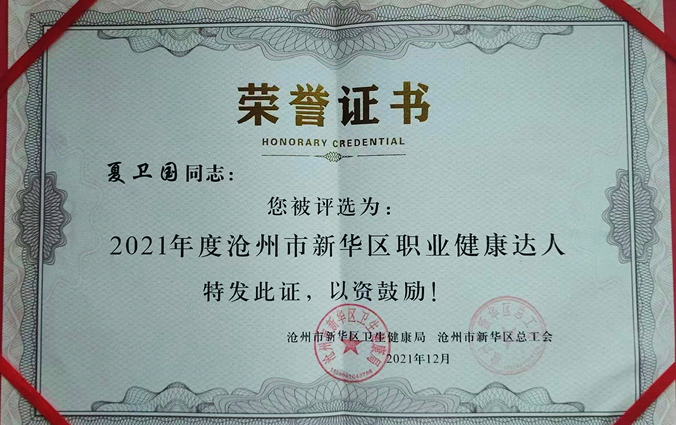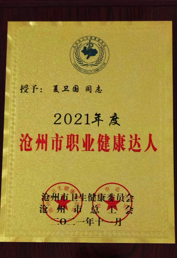 夏卫国同志所获的荣誉,是沧州市卫生健康委员会和沧州市总工会对公司职业健康工作的肯定与认可,公司将一如既往的加大对职业健康的投入,确保所有员工在工作中都能得到应有的健康保障。