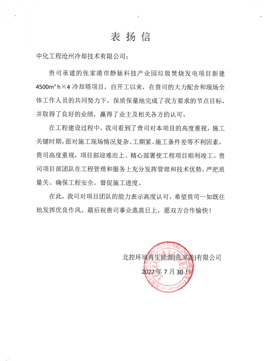 公司积极践行国家“碳达峰、碳中和”战略,大力开创绿色环保冷却塔项目,大大协助提升了北控环境集团固废处置板块在国内经济发达的苏南长江经济带的影响力。该项目的建成,将实现张家港市全市生活垃圾处理无害化、减量化和资源化,并取得良好的社会效益、环境效益和经济效益,全面助力张家港市生态环境保护,对提升张家港市整体形象、改善综合环境具有重大意义。此次收到表扬信,得到业主公司的认可,使项目部全体员工备受鼓舞,纷纷表示在今后的施工中,将继续坚持“高质量高标准”的服务与产品,为打造企业品牌,树立企业形象而努力奋斗。