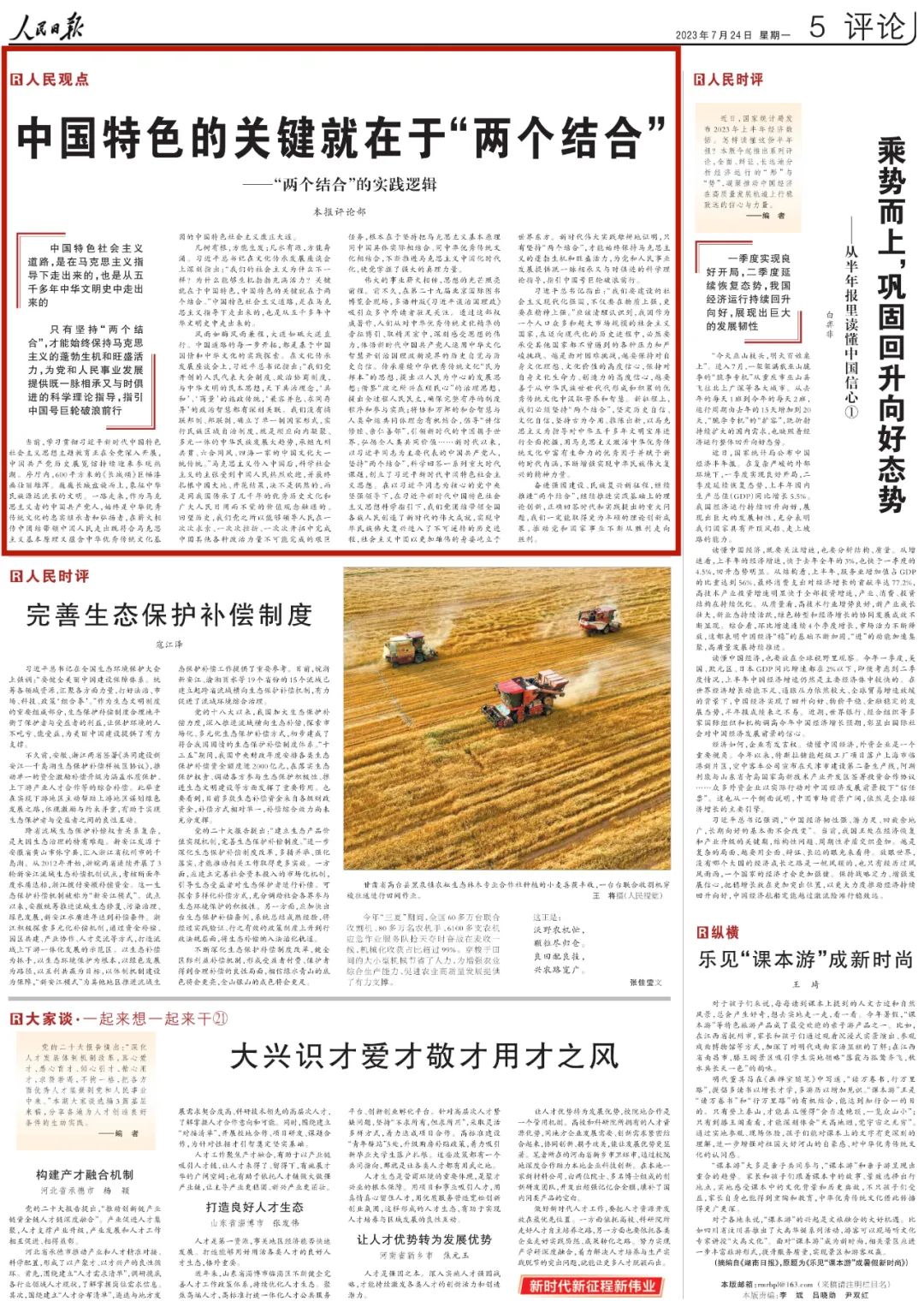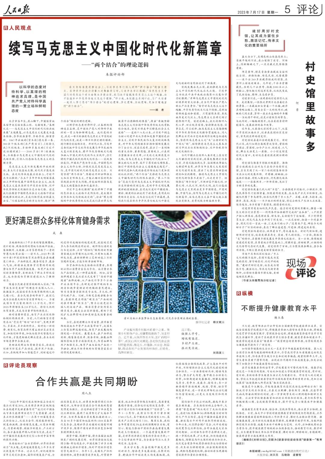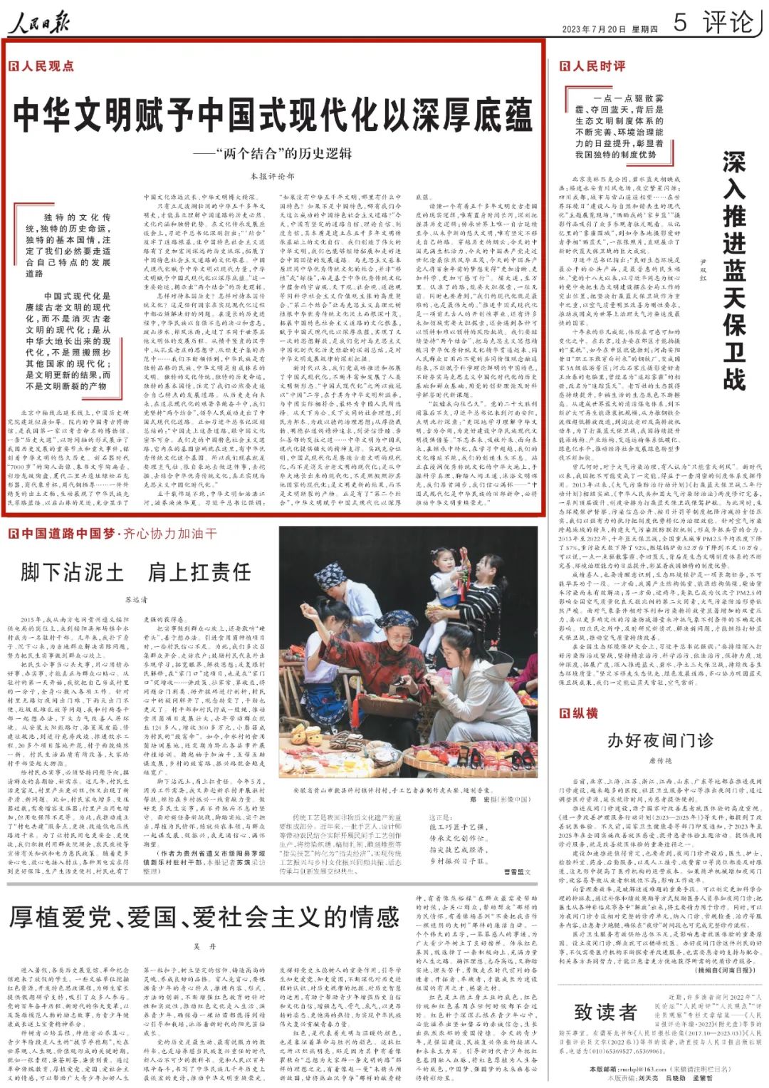 在文化传承发展座谈会上,习近平总书记深入阐释“两个结合”的重大意义。在中共中央政治局第六次集体学习时,习近平总书记强调:“马克思主义中国化时代化这个重大命题本身就决定,我们决不能抛弃马克思主义这个魂脉,决不能抛弃中华优秀传统文化这个根脉。”《人民日报》推出系列评论,与广大读者一起深入学习思考“两个结合”的理论逻辑、历史逻辑、实践逻辑,更加自觉地坚持“两个结合”。
