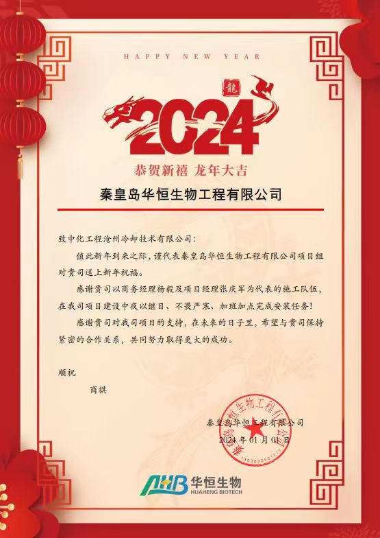 1月1日,沧冷公司收到了秦皇岛华恒生物工程有限公司的表扬信,对沧冷公司在秦皇岛华恒生物工程项目建设过程中,不畏艰难、精心策划、科学管理、尽心尽职的工作态度表示赞扬。