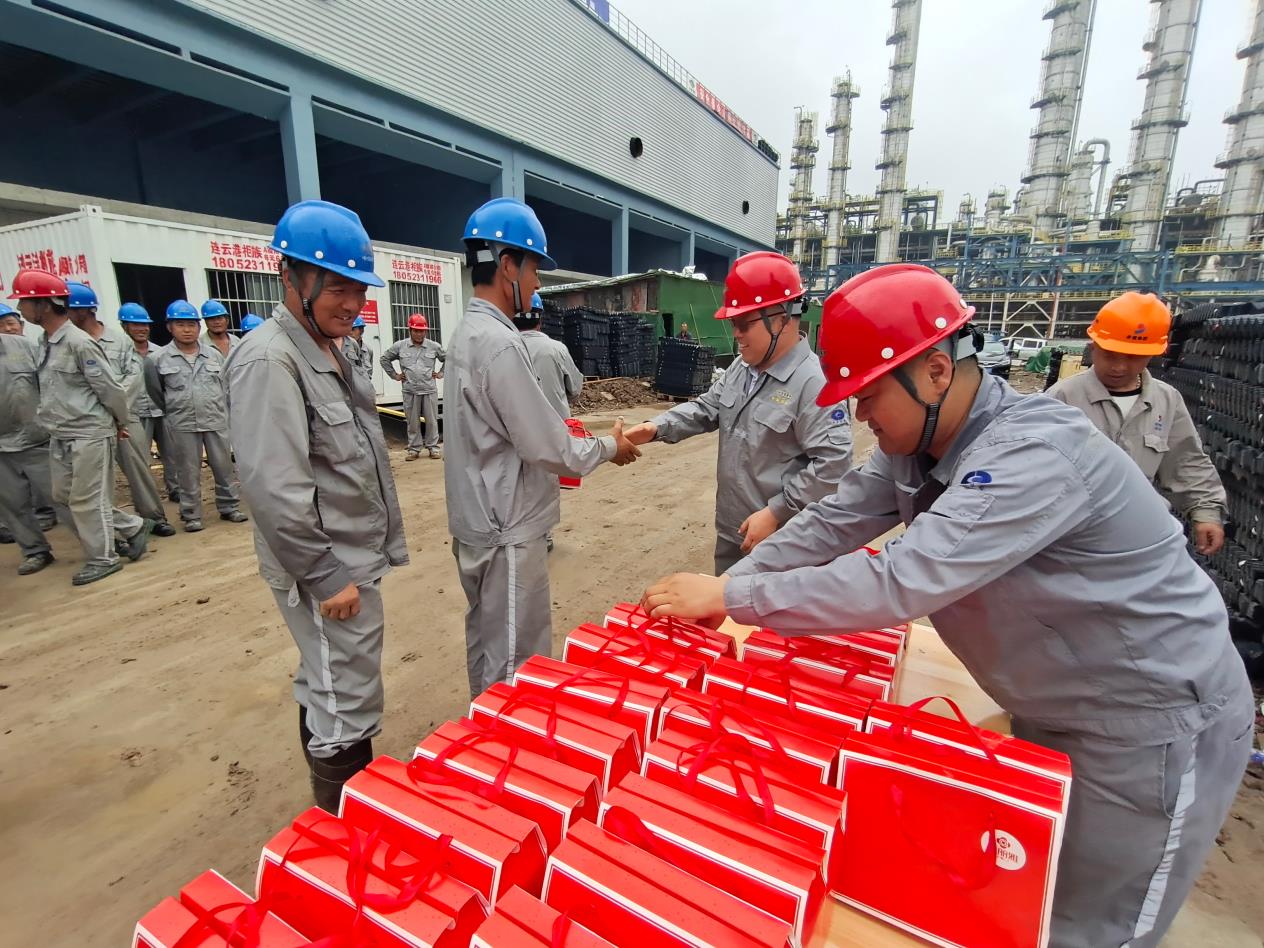 6月14日,正值端午佳节,公司总经理梁海兵、副经理柴洪浩到江苏斯尔邦项目施工现场,对坚守在施工一线的员工进行走访慰问,并送去了粽子、鸡蛋、凉茶等慰问品。