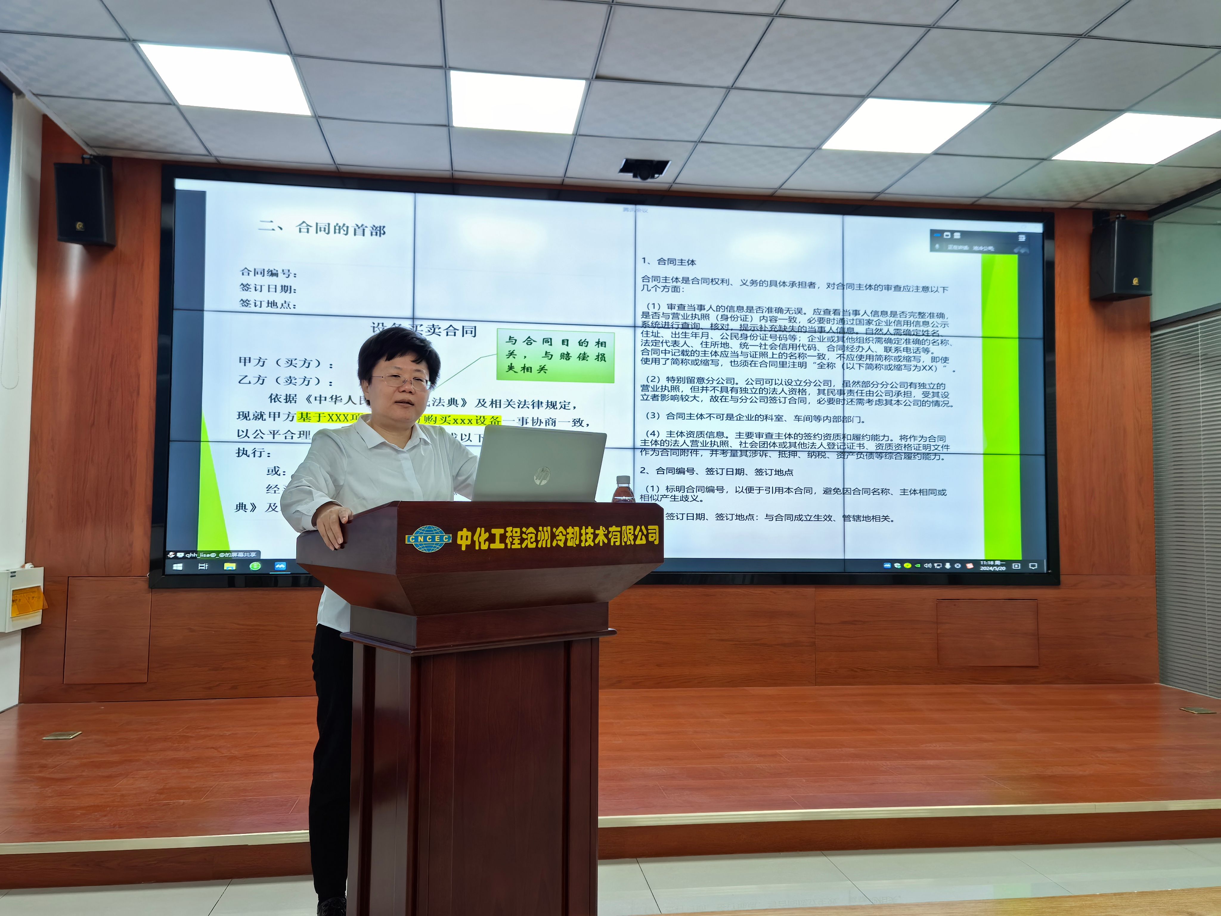 为进一步提高合同管理人员的法律意识,规范公司合同管理工作。5月20日,沧冷公司在四楼会议室组织了设备买卖合同主要条款规范培训暨守住法律底线预防职务犯罪培训会,各职能部室负责人、业务骨干近30余人参加了此次培训,培训特邀装备科技公司办公厅(投资规划部、法律合规部)副主任秦海华前来授课。