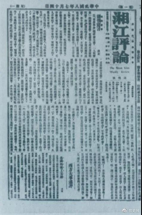 7月14日 《湘江评论》创刊。毛泽东在《湘江评论》创刊宣言中指出:“世界什么问题最大?吃饭问题最大。什么力量最强?民众联合的力量最强。”《湘江评论》创刊号寄到北京后,李大钊给予了高度评价。《晨报》也予以介绍,说它“内容完备”“魄力非常充足”。