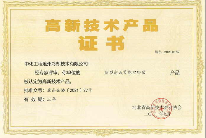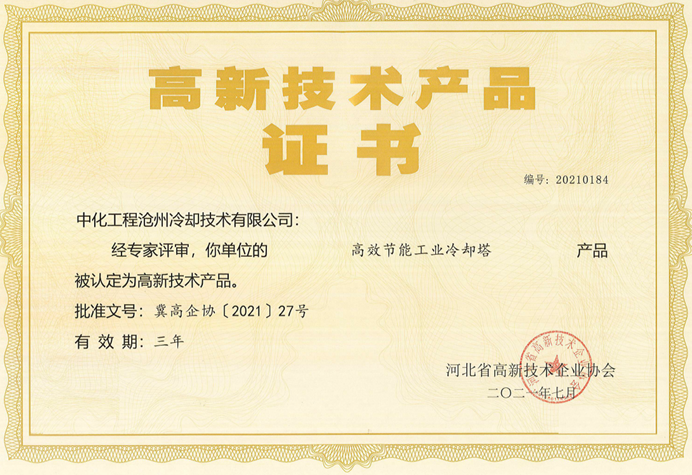 高新技术产品是国家和省高新技术重点范围、技术领域和产品参考目录的全新型产品,具有较高的技术含量、良好的经济效益和广阔的市场前景,能够提高产品市场竞争力,高新技术产品的认定直接证明了产品的高科技含量,增加了客户的信任度。为了获此荣誉,公司于2021年6月就对高效节能工业冷却塔、新型节水消雾冷却塔、高效节能工业循环水系统、新型高效节能空冷器这四大产品进行了认定工作。