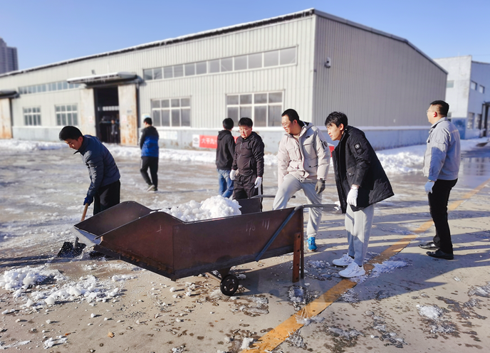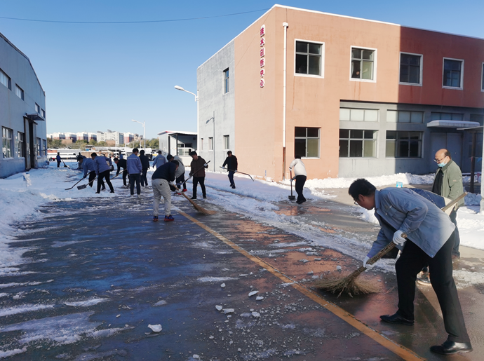 大家不畏严寒、干劲十足。陆续到达后,来不及放下随身携带的物品,便立刻拿起工具加入扫雪队伍。在总经理梁海兵的带领下,员工们挥舞着铁锹和扫帚对厂区内的积雪和结冰进行了清扫,大家齐心协力相互配合,有铲雪的、有扫雪的、有运雪的,分工明确干的热火朝天,不亦乐乎。经过一个多小时的辛勤劳动,厂区内的主要入口、主干道等地的积雪全部铲除。