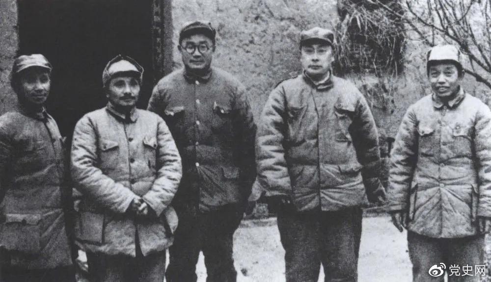 1948年11月6日至1949年1月10日,由刘伯承、陈毅、邓小平、粟裕、谭震林组成,以邓小平为书记的总前敌委员会,率华东野战军和中原野战军及部分地方武装进行淮海战役。长江中下游以北广大地区解放。图为总前敌委员会成员合影。