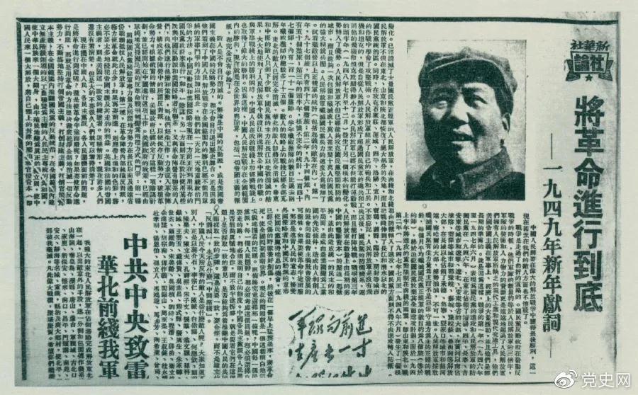 新华社发表毛泽东撰写的一九四九年新年献词《将革命进行到底》。文章根据中国人民将要在伟大的解放战争中获得最后胜利的情况,指出:敌人是不会自行消灭的,不会自行退出历史舞台的,我们必须用革命的方法,坚决彻底干净全部地消灭一切反动势力,不动摇地坚持打倒帝国主义,打倒封建主义,打倒官僚资本主义,在全国范围内推翻国民党的反动统治,在全国范围内建立无产阶级领导的以工农联盟为主体的人民民主专政的共和国。使中华民族来一个大翻身,由半殖民地变为真正的独立国,使中国人民来一个大解放,将自己头上的封建的压迫和官僚资本(即中国的垄断资本)的压迫一起掀掉,并由此造成统一的民主的和平局面,造成由农业国变为工业国的先决条件,造成由人剥削人的社会向着社会主义社会发展的可能性。文章宣布:一九四九年中国人民解放军将向长江以南进军,将要召集以完成人民革命任务为目标的政治协商会议,宣告中华人民共和国的成立,并组成共和国的中央政府。这篇文章收入《毛泽东选集》第四卷。