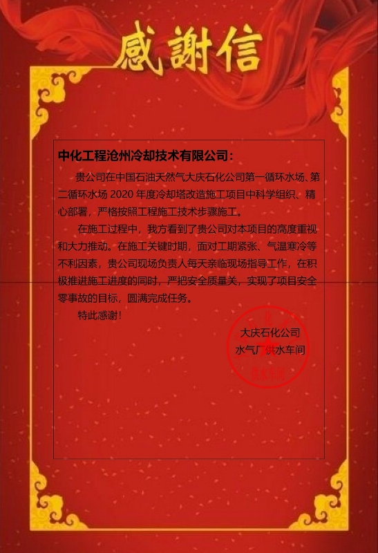 公司承建的大庆水汽项目收到业主感谢信