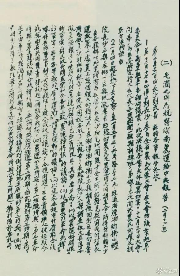 1927年2月16日,毛泽东就考察湖南农民运动情况给中共中央的报告。