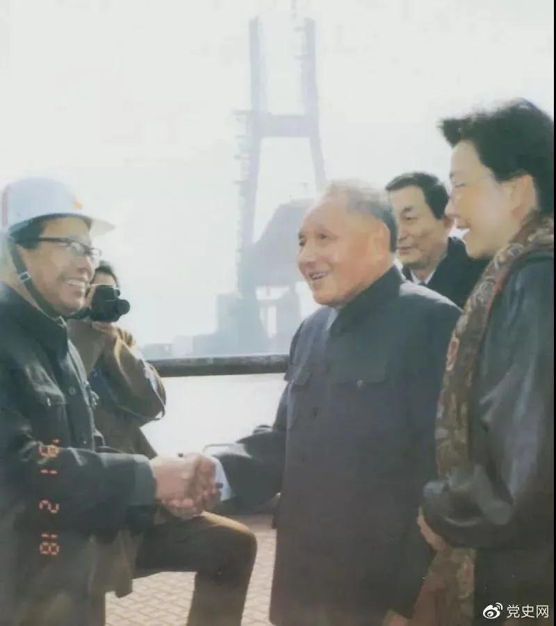 1991年2月18日,邓小平视察上海南浦大桥工地时同大桥工程设计人员握手。