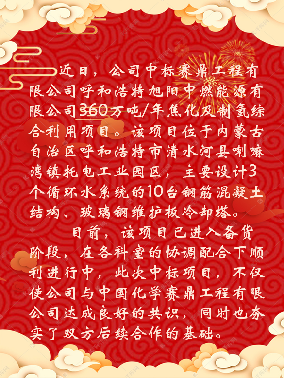 公司中标赛鼎工程有限公司360万吨年焦化及制氢综合利用项目